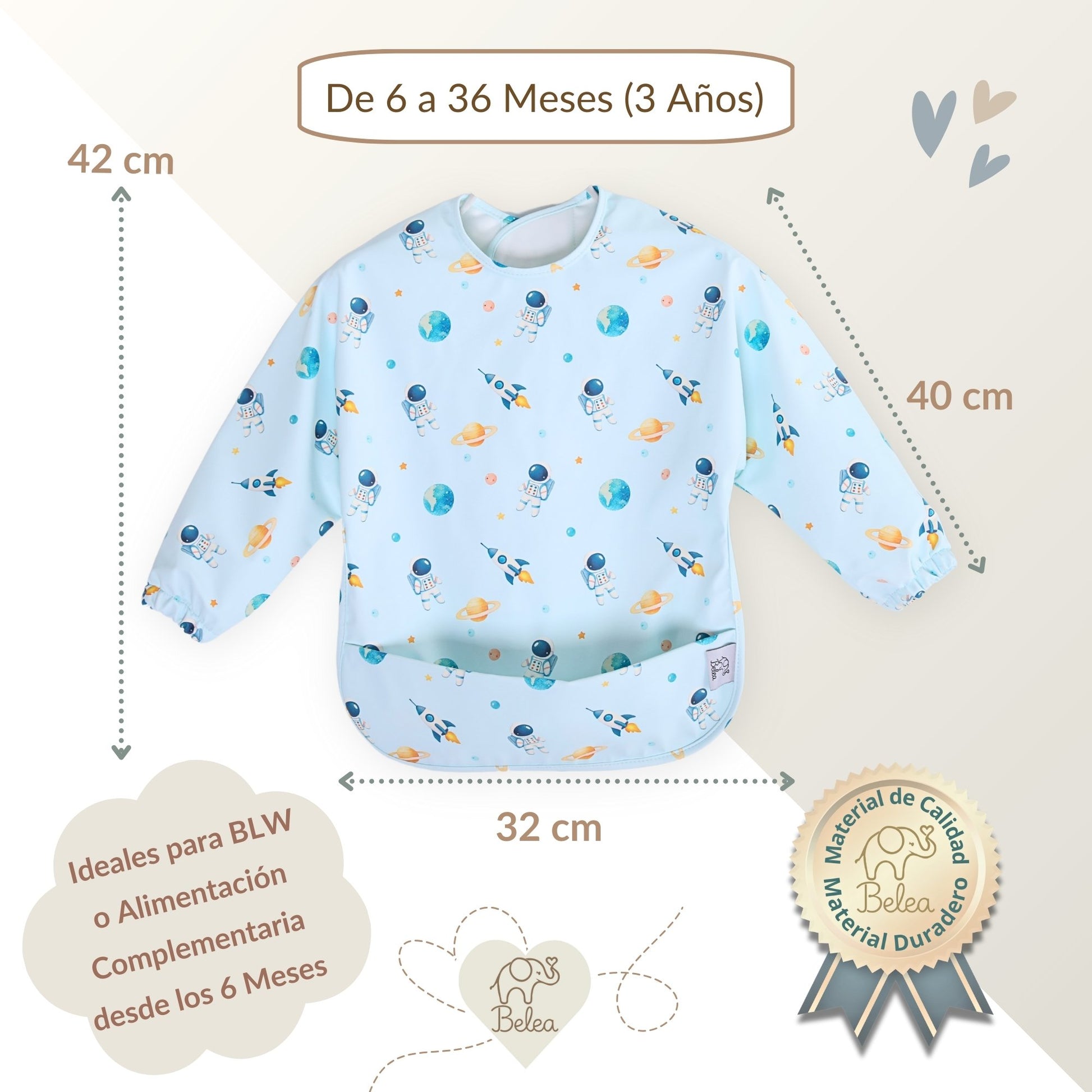 ⇨ IDEAL PARA BEBÉS ENTRE 6 a 36 MESES (3 años): El babero con mangas es ideal para bebés de 6 a 36 meses, mientras que el babero sin mangas se adapta hasta los 5 años, brindando una protección prolongada a medida que tu pequeño crece.