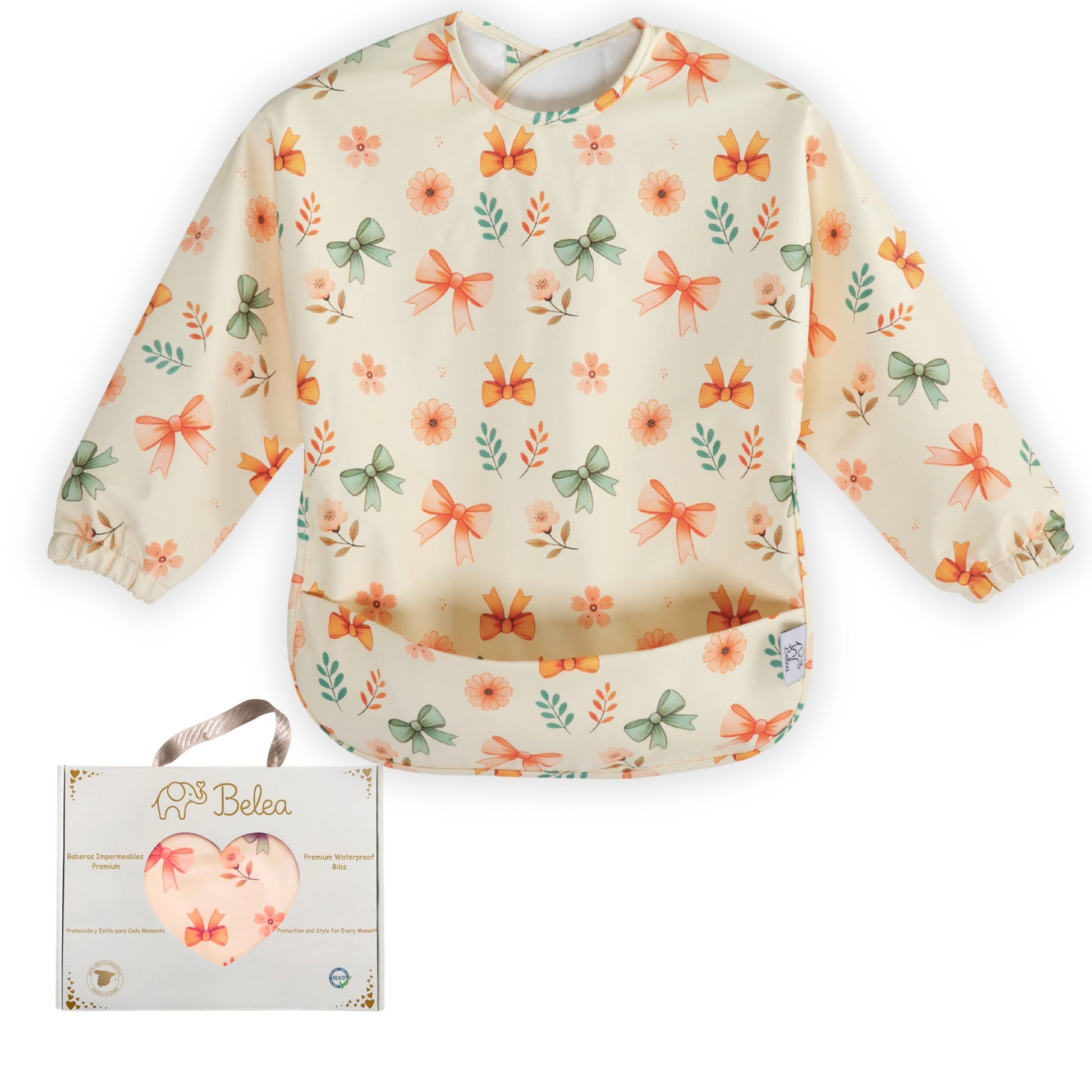 Nuestro babero impermeable de manga larga protege con suavidad sin renunciar al diseño.