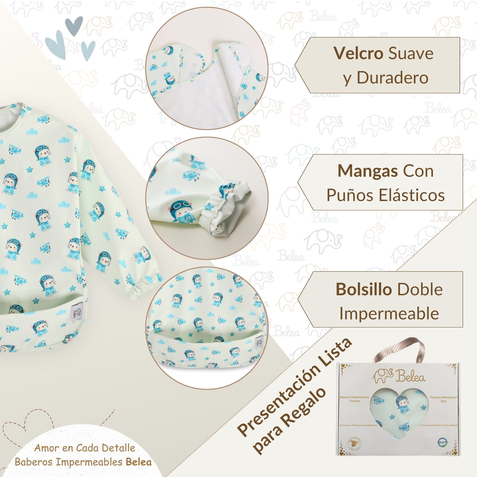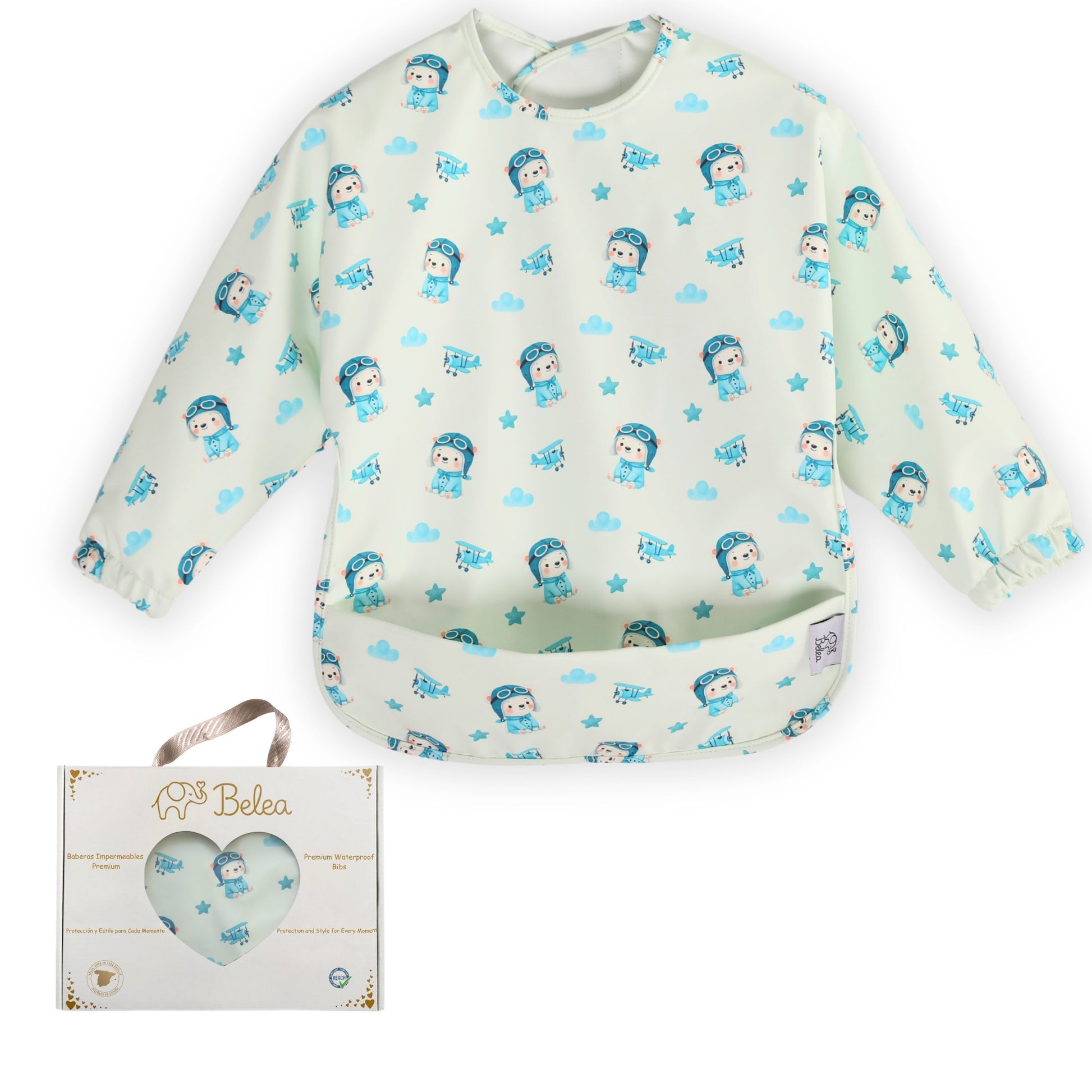 Nuestro babero impermeable de manga larga protege con suavidad sin renunciar al diseño.