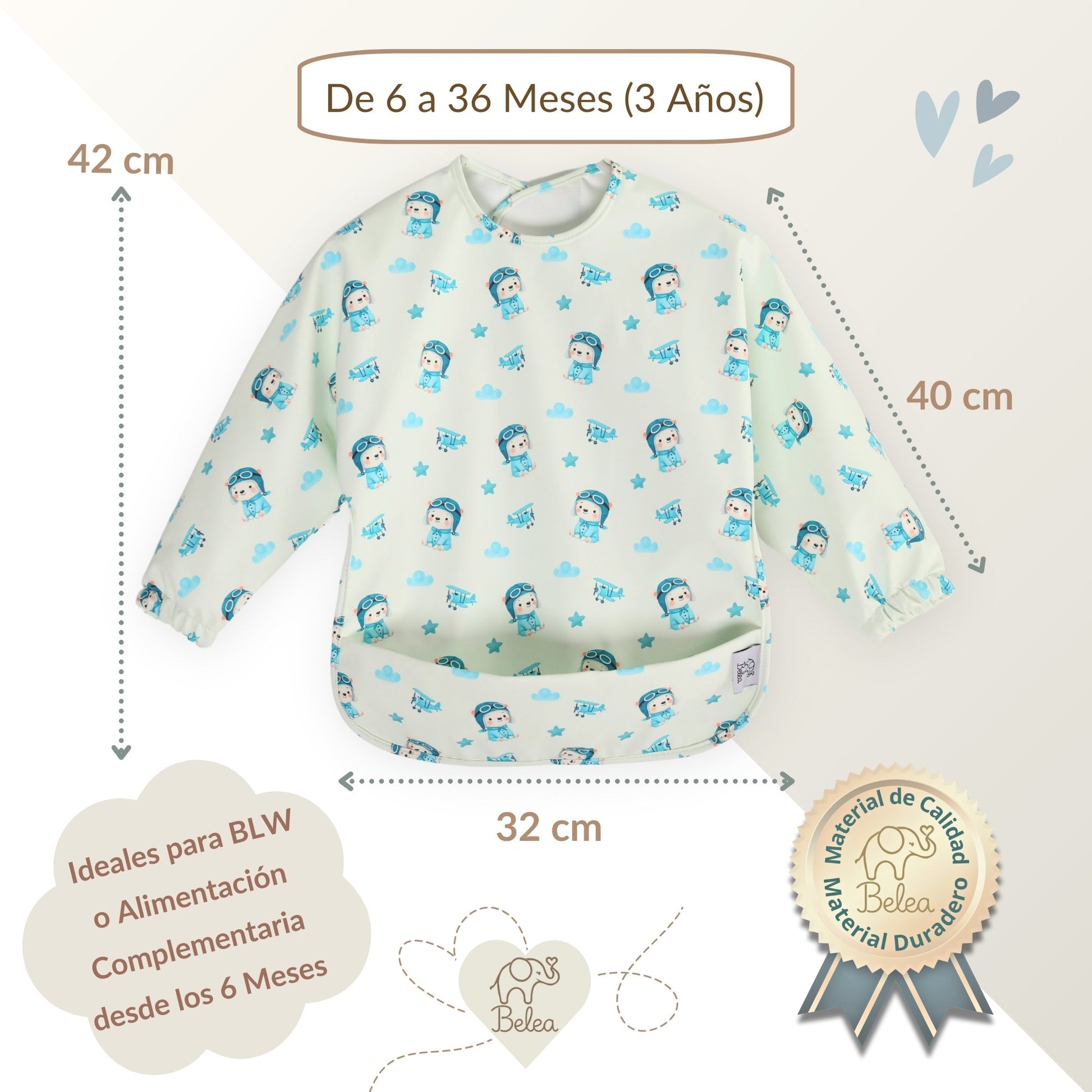 ⇨ IDEAL PARA BEBÉS ENTRE 6 a 36 MESES (3 años): El babero con mangas es ideal para bebés de 6 a 36 meses, mientras que el babero sin mangas se adapta hasta los 5 años, brindando una protección prolongada a medida que tu pequeño crece.