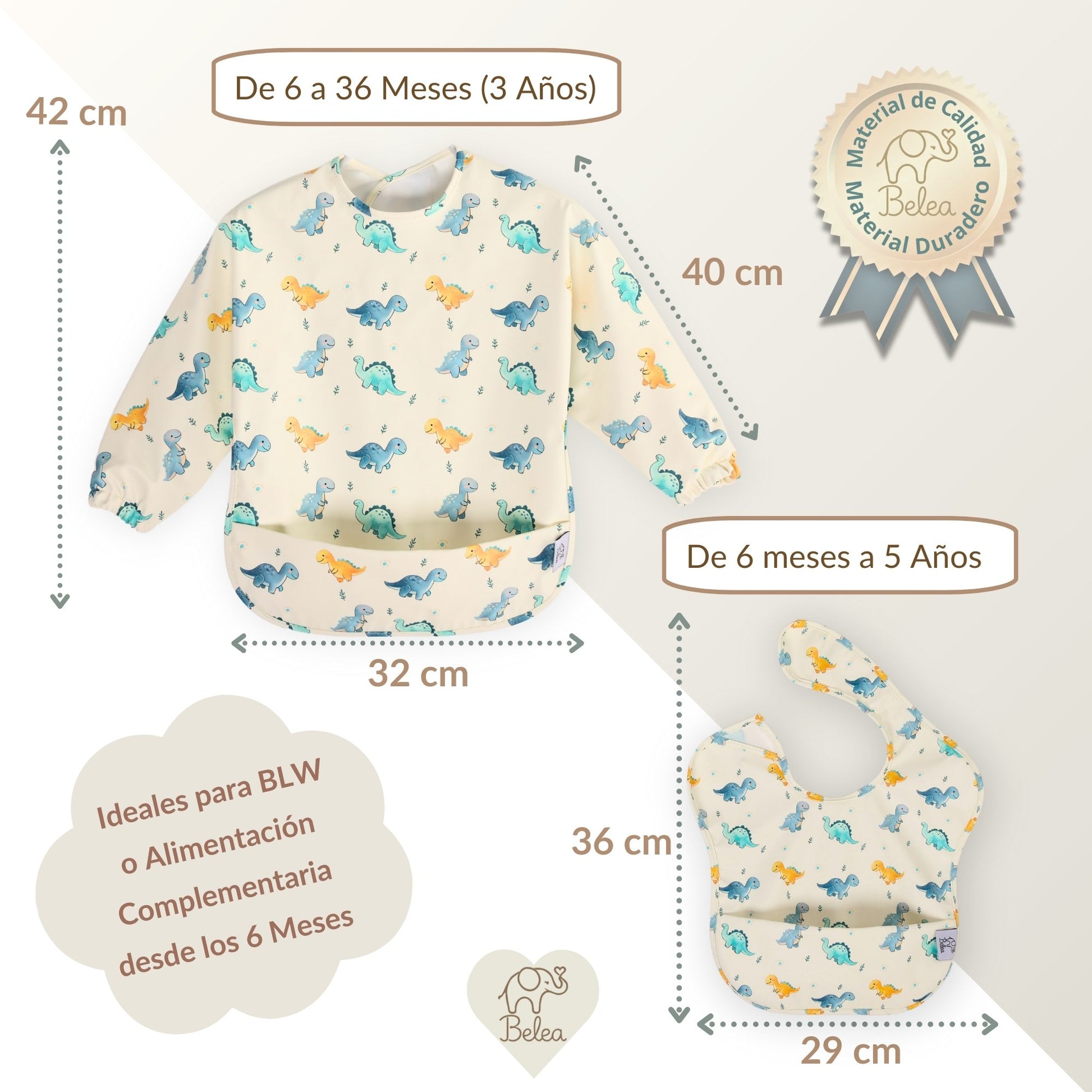 ⇨ IDEAL PARA BEBÉS ENTRE 6 a 36 MESES (3 años): El babero con mangas es ideal para bebés de 6 a 36 meses, mientras que el babero sin mangas se adapta hasta los 5 años, brindando una protección prolongada a medida que tu pequeño crece.