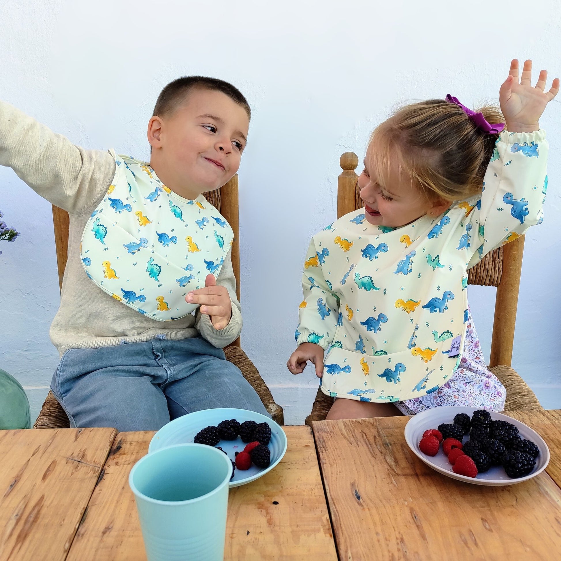 Nuestro pack de baberos más versátil: incluye un babero con mangas y otro sin mangas, la combinación perfecta para elegir según el momento.