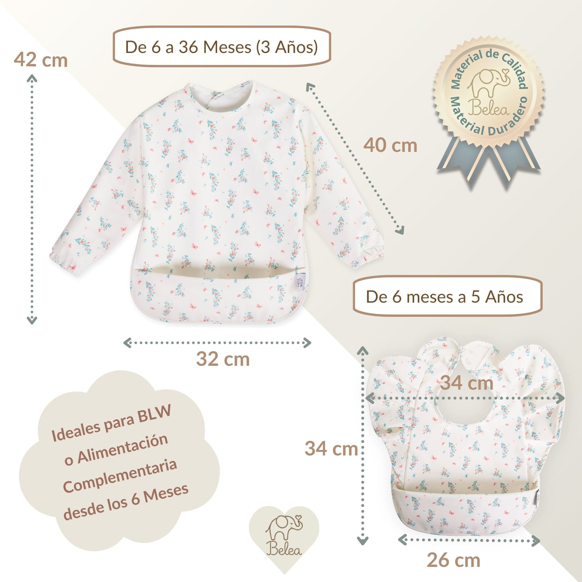 ⇨ IDEAL PARA BEBÉS ENTRE 6 a 36 MESES (3 años): El babero con mangas es ideal para bebés de 6 a 36 meses, mientras que el babero sin mangas se adapta hasta los 5 años, brindando una protección prolongada a medida que tu pequeño crece.