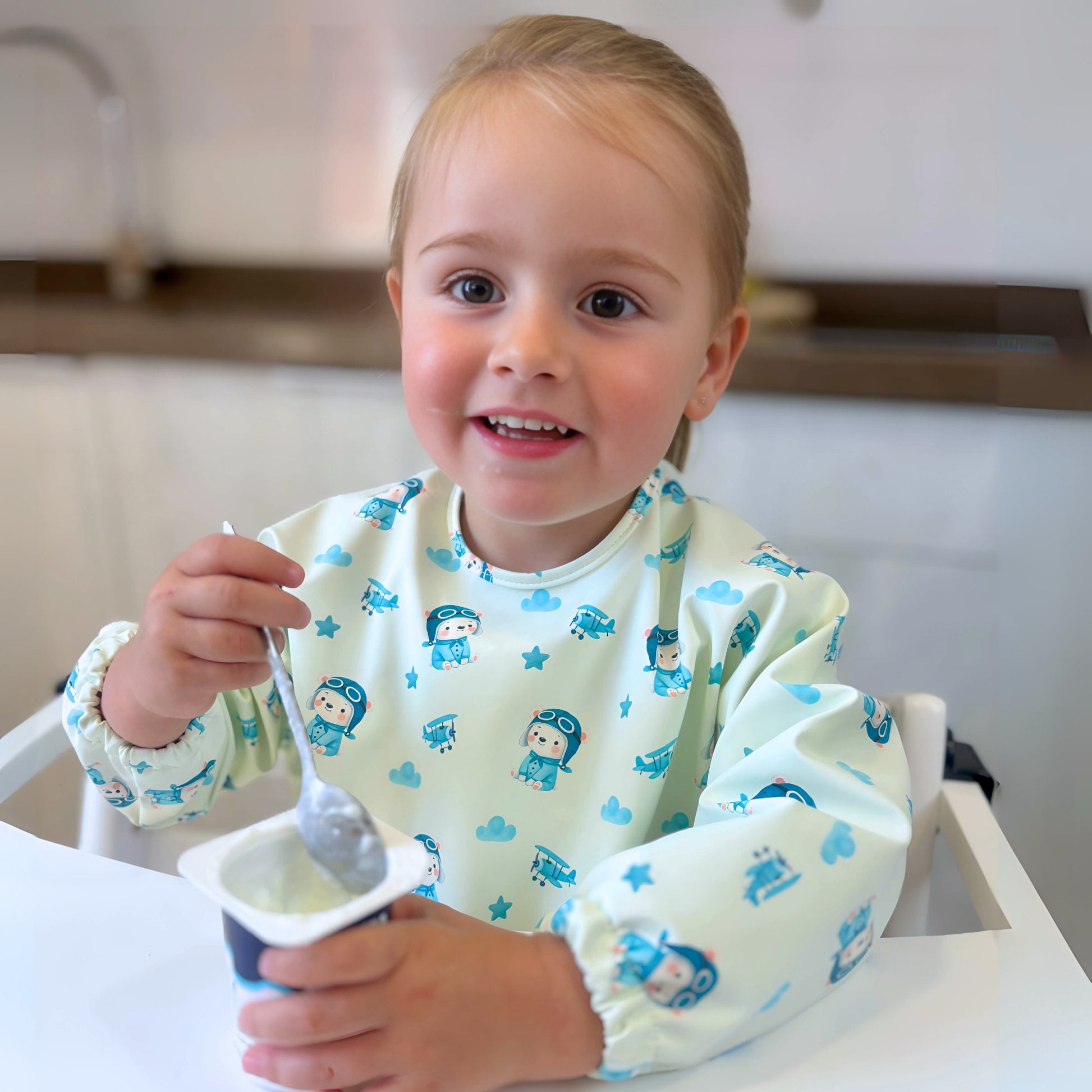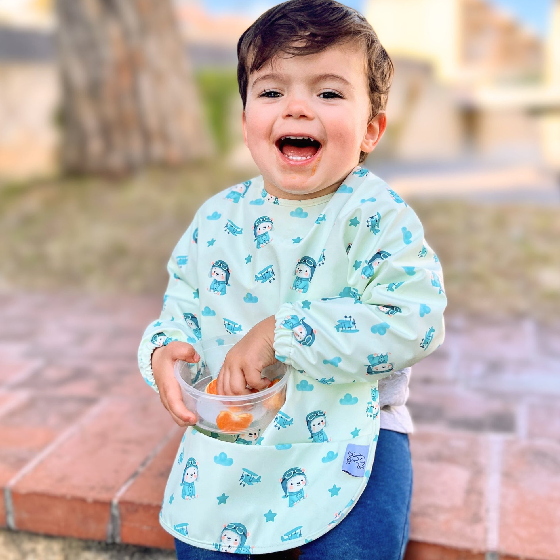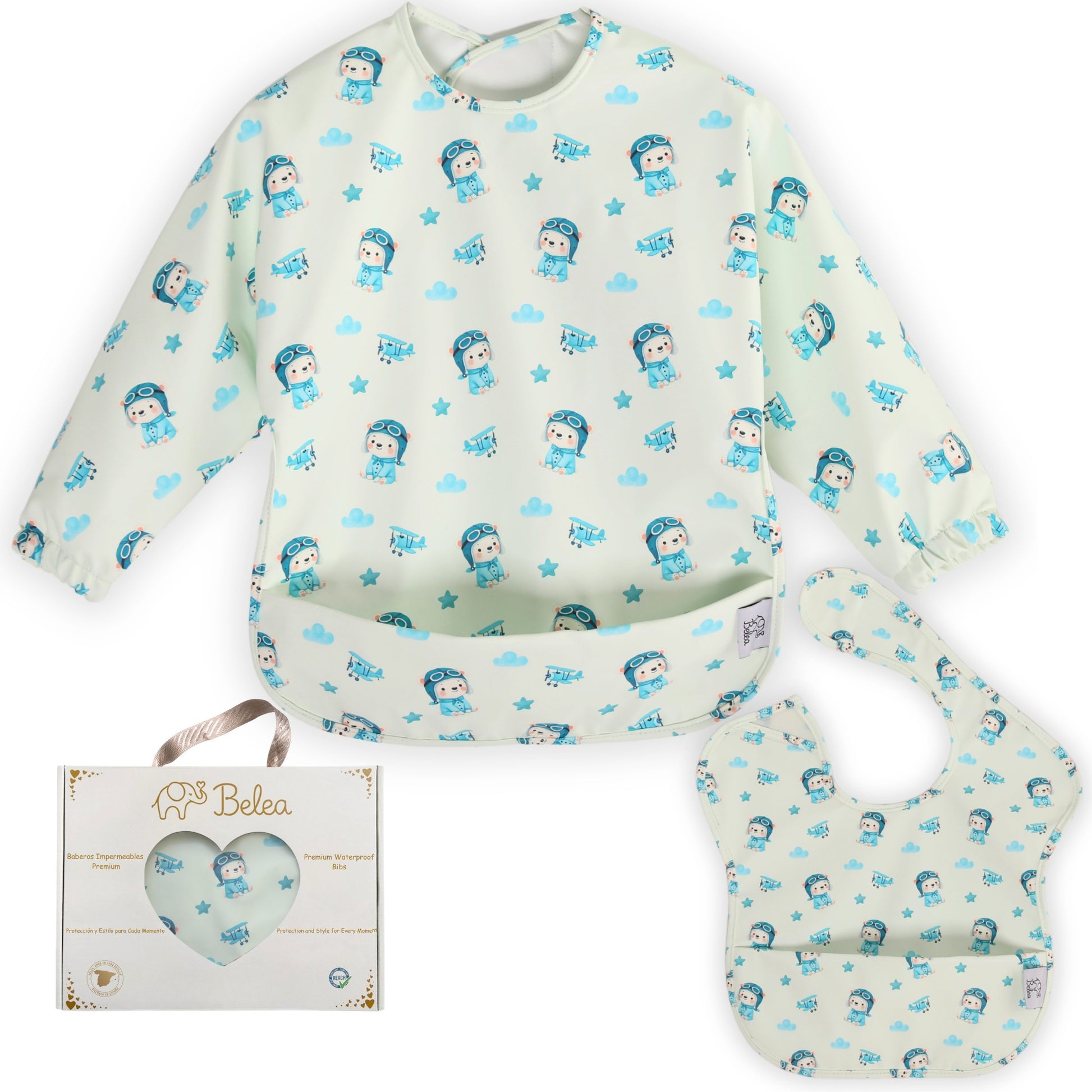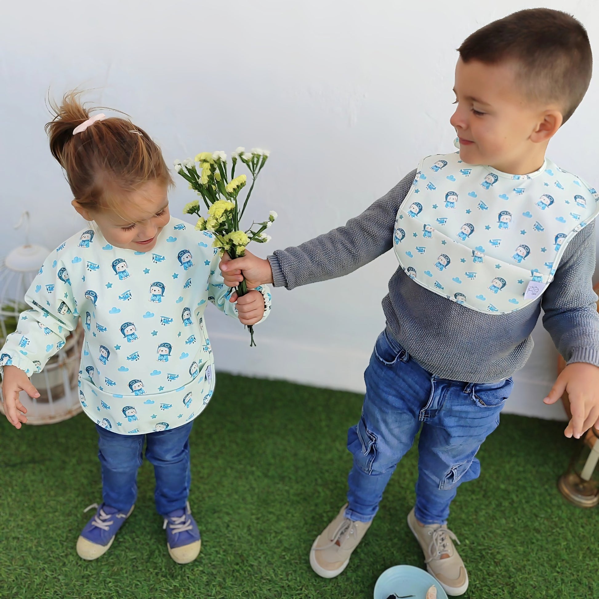 Nuestro pack de baberos más versátil: incluye un babero con mangas y otro sin mangas, la combinación perfecta para elegir según el momento.