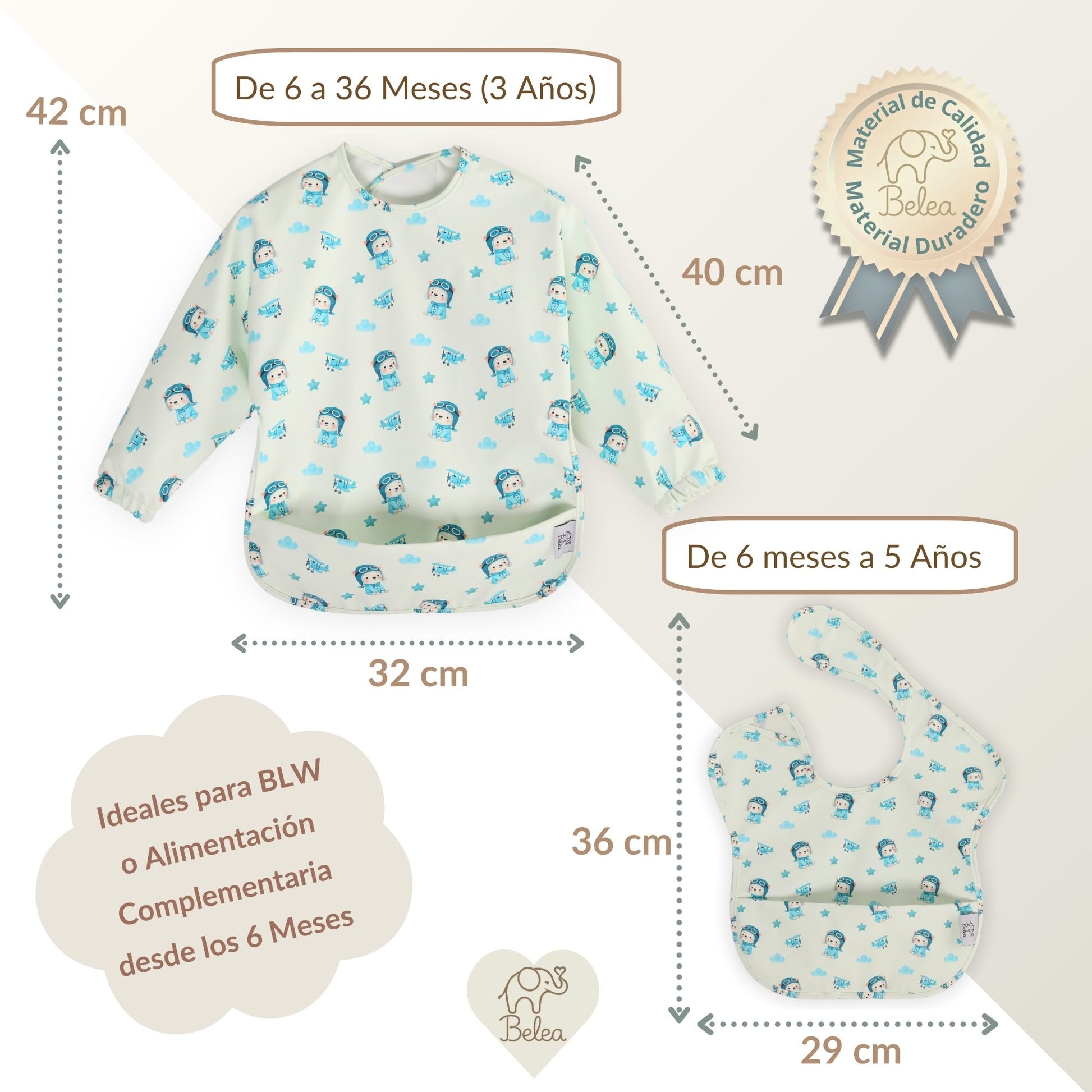 ⇨ IDEAL PARA BEBÉS ENTRE 6 a 36 MESES (3 años): El babero con mangas es ideal para bebés de 6 a 36 meses, mientras que el babero sin mangas se adapta hasta los 5 años, brindando una protección prolongada a medida que tu pequeño crece.