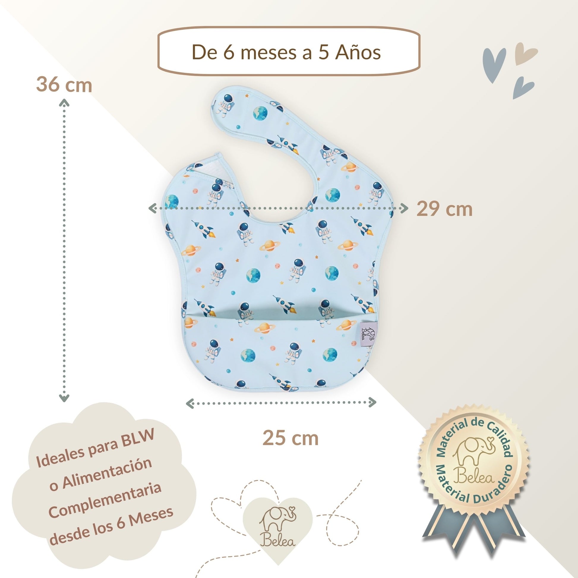Nuestros Baberos Impermables están diseñados para adaptarse a cualquier momento del día. Ya sea durante las comidas en casa o al aire libre, o en actividades creativas, estos baberos mantienen la ropa de tu bebé impecable. Perfectos para el método BLW (Baby Led Weaning).La calidad del material garantiza la resistencia al uso diario sin deteriorarse.